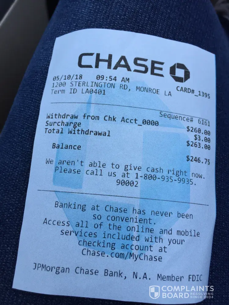 Ok, I live in Monroe, Louisiana where I went to a Chase Bank near my home. The only reason I go there because my landlord deals with Chase. So I proceed to put my card in machine over there to find out seconds later that it's broken no sign was up stating it was broken or anything so it didn't give me money ! So now I'm out of 263.00 of my rent money and might get evicted and then in order to get my money back I had to file a Dispute with bank cause Chase doesn't service non customers nor third party banks but a consumer that's not fair! Now I'm almost terrified that I'm going to get evicted because I have no money for my rent! Cause they didn't notify customers the machine was broken.