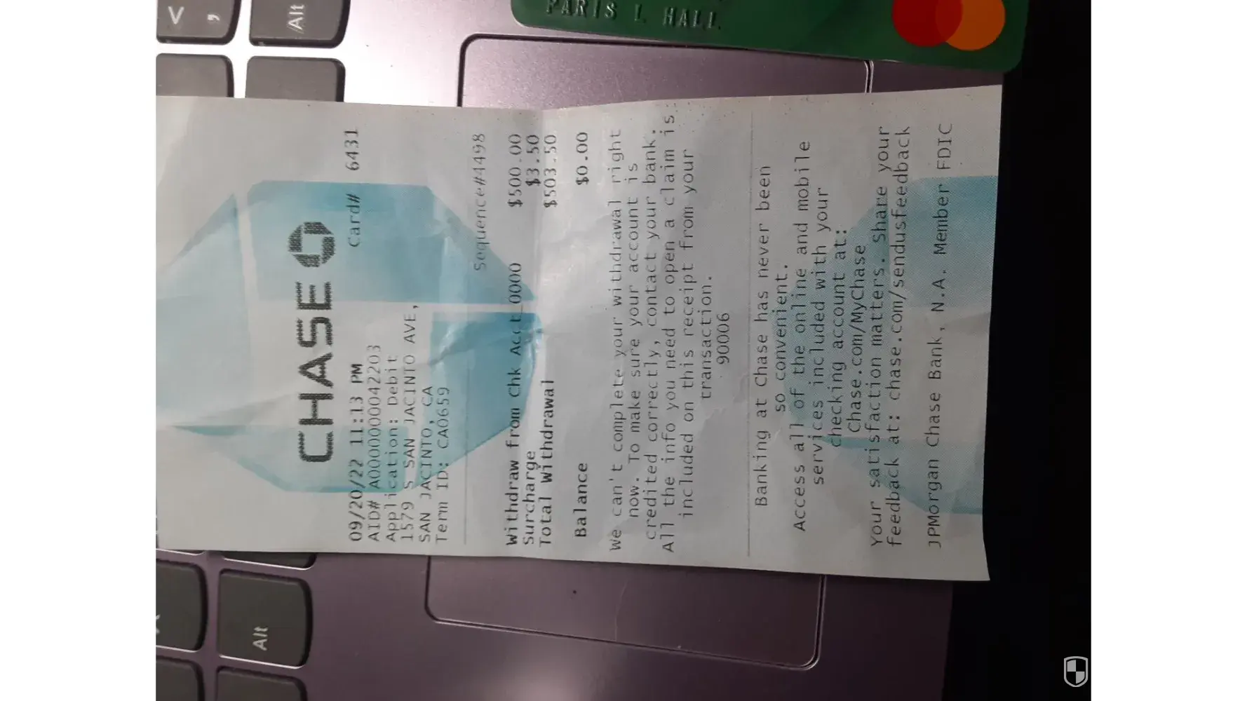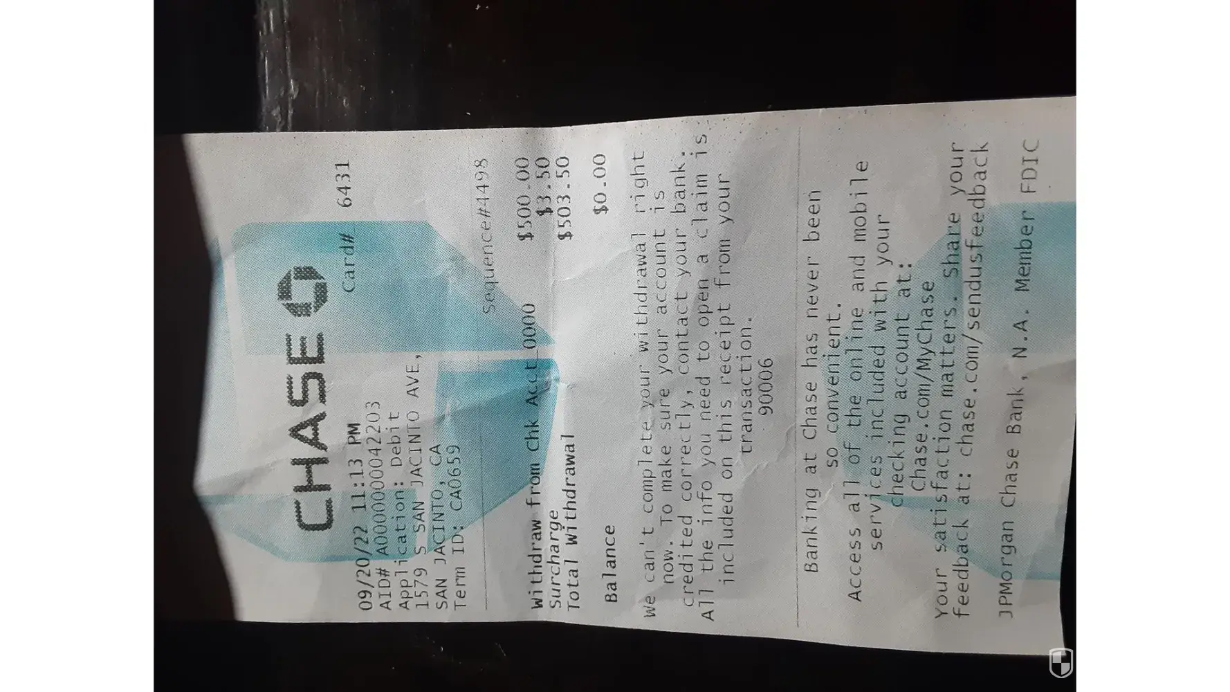 On 9/20/2022, 11:13 pm, card #6431, aid# a0000000042203, application: debit. 1579 s. San jacinto ave, san jacinto, ca. 92583 terminal id: ca0659 sequence # 4498 withdraw from chk acct 0000 $500.00 surcharge $3.50 total withdrawal $503.50 the teller did not give me any money nor did the credit the 503.50 back to my account. The reciept says: we can't...