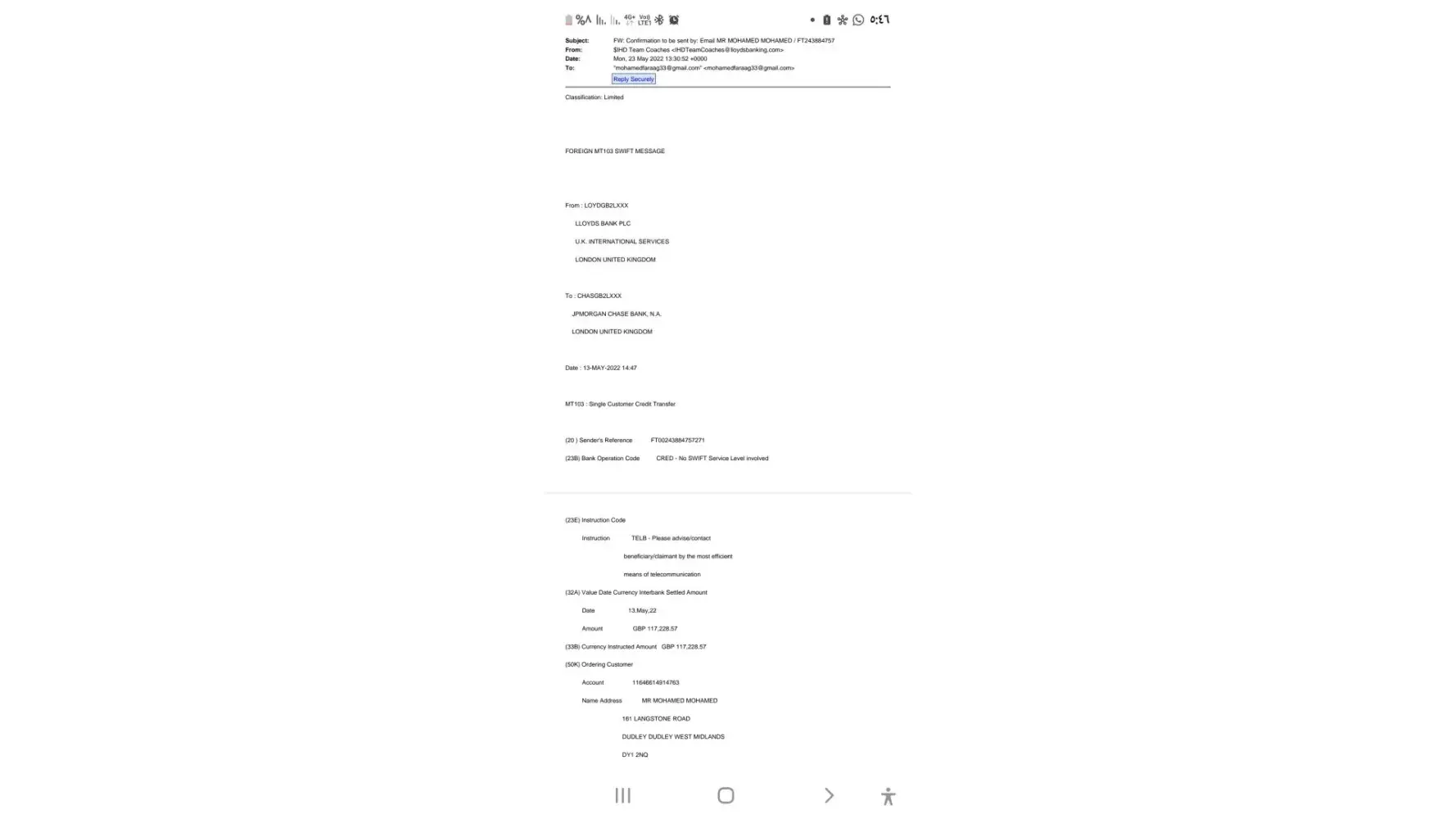 JPMorgan Chase A problem with the process of transferring personal funds from UK to Egypt