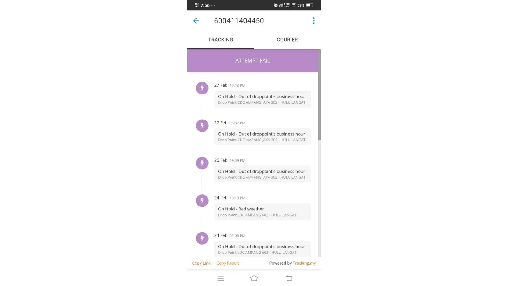 Parcel telah dihantar pada 23/2 akan tetapi parcel still on hold di cdc ampang jaya, no tracking [protected]. Right now dah 2/3 tau. Ini dah overdate . System dalam jadual tidak diupdate. Last update 27/3. Please handle this issues ASAP. Penerima tidak menerima sebarang parcel.