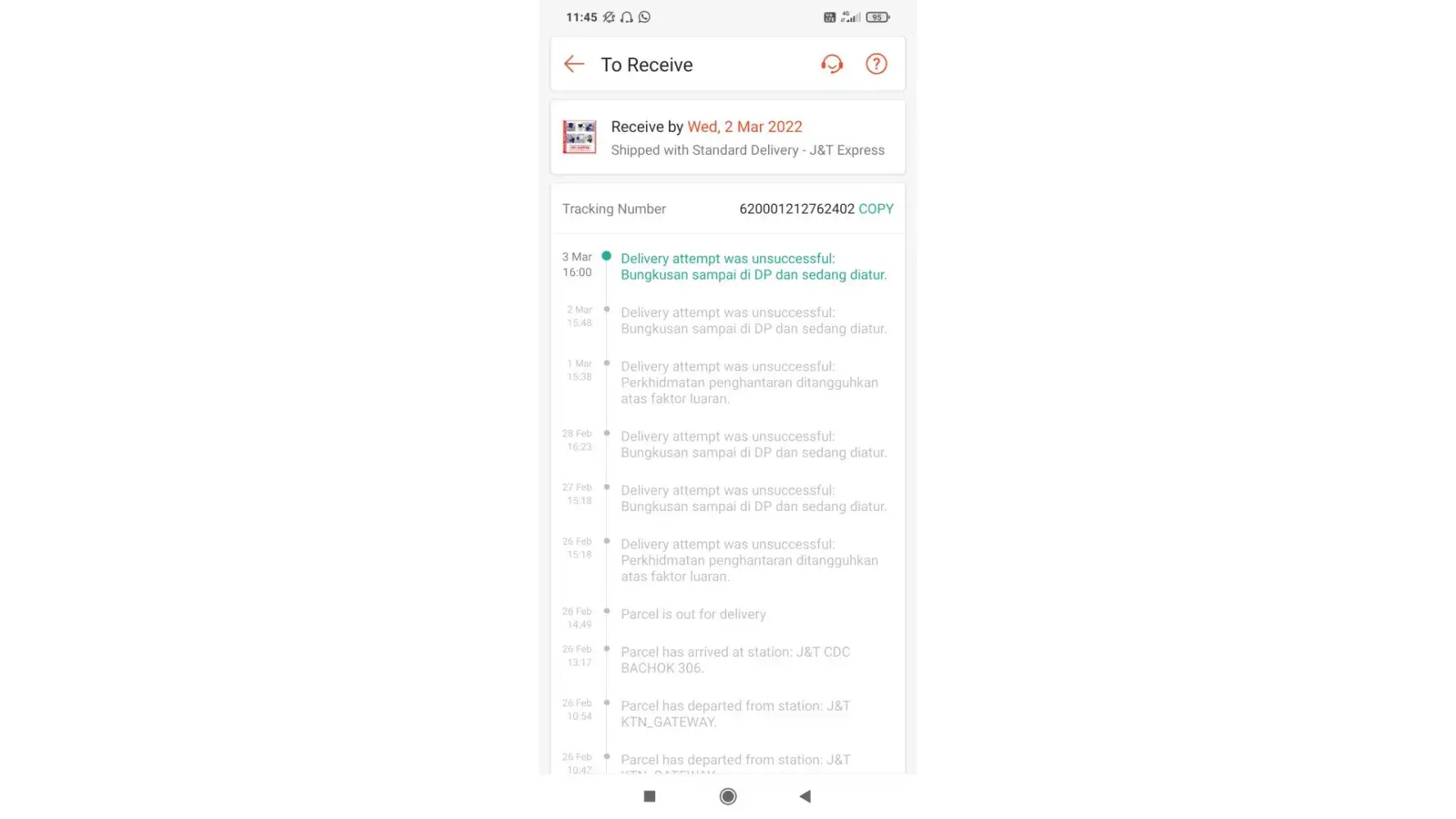 Barang saya dah sampai dkt jnt 26feb lagi tapi sampai harini belum dihantar dkt saya.. saya urgent nak guna hm😓 tolong la perbaiki