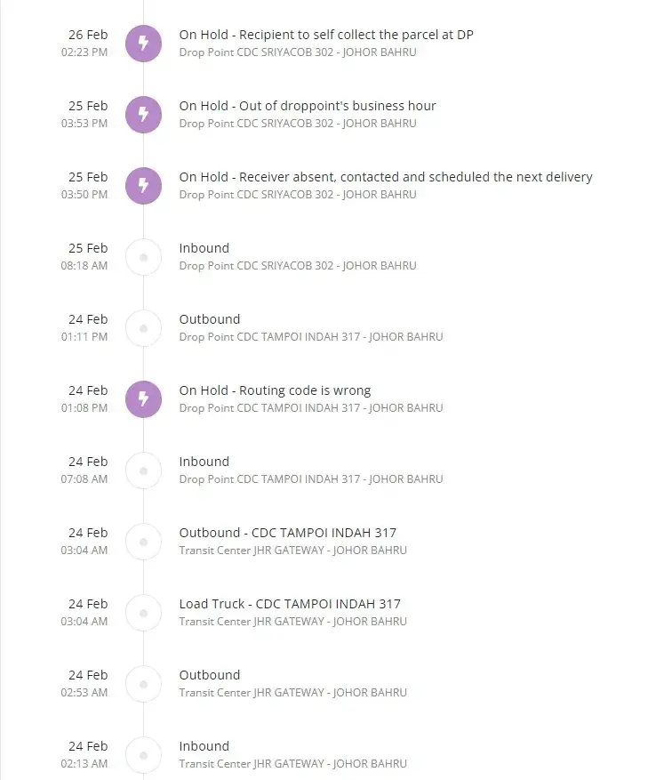 I ordered something on Shopee on 25th Feb. From tracking, the item arrived at J&T CDC Senawang on 27th Feb and delivery is supposed to happen by 4th March. Today is 6th March & it still says - Parcel is in transit: J&T CDC Senawang 312.
