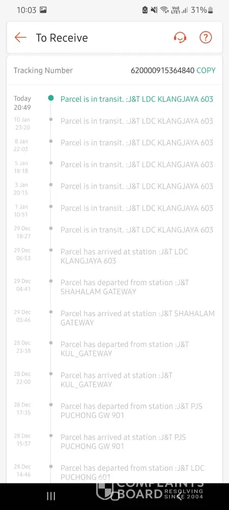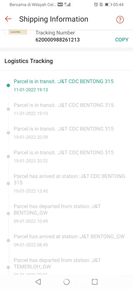 Parcel [protected] berada di J&T CDC BD. TEKNOLOGI 301 DARI TARIKH 6/1/2022 SEHINGGA HARI INI 14/1/2022.SUDAH 9 HARI BERADA DI SANA.