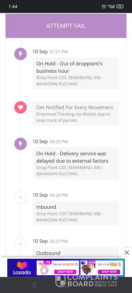 Kenapa ye barang saya tidak sampai lagi, dah 9 hari tak sampai lagi. Dah 9 hari status parcel "bad weather" saya nak guna barang itu isnin minggu hadapan. Mohon settlekan kes saya ini secepat yang mungkin.