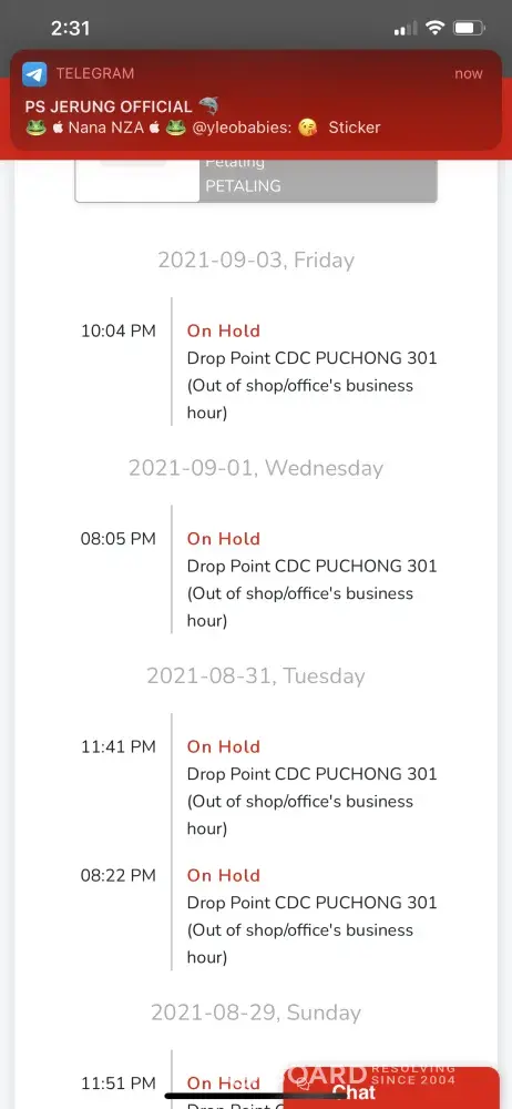Parcel [protected] had been stuck for 7days at drop point cdc tmn. Melati 310, parcel tersebut adalah inai organik . Yang tak boleh melebihi 7hari dari luat peti . Mohon jasa baikkk pihak jnt untuk kawal apa masalah yg jadi drop point cdc tmn. Melati 310, last update adalah 3 september 2021 . Mohon bantuan semakan dari pihakk jnt . Jasa baikk amat sy hargai