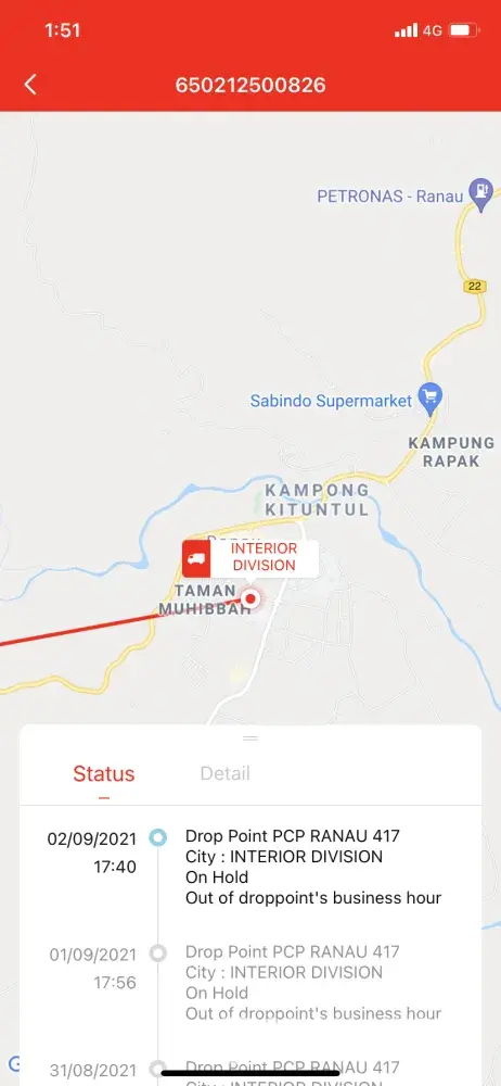 Hello, the parcel (tracking number above) as stated are not yet moving since 22/08/2021. How long does it take to arrived ya? 650212500826 This is the tracking number, could you please call the person in charge to give me explaination on it? It was stuck at SHB 147 ranau. I chose jnt as the main courier because it was expected to arrived fast. But now I couldn't even reach out to your officer through Facebook or WhatsApp to ask about my parcel. Thankyou