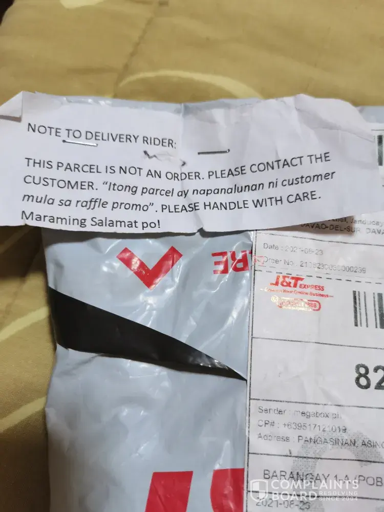 The rider did not inform about the note. If he informed properly the note address to him, I could have return the parcel because I was charge despite winning the raffle. Hence a scam. The parcel came from megaboxph, address in pangasinan.