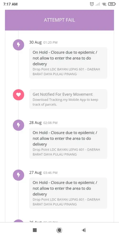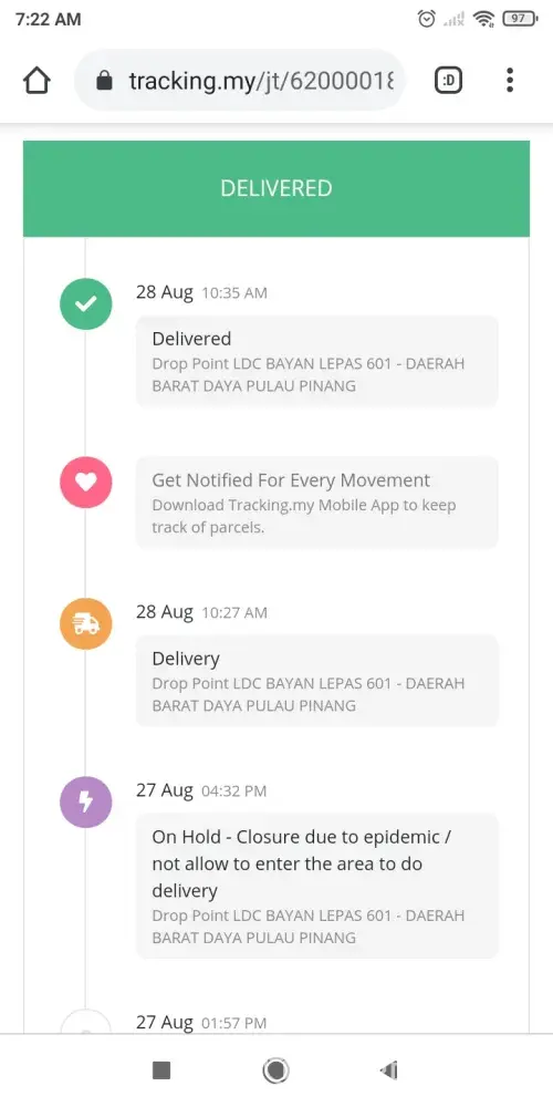 Dah lama peram barang kat bayan lepas ckp brg xleh hantar sebab pkpd.rumah kat sg ara, xde pun pkpd, bayan lepas pun xde pkpd buat masa skrg, tp jnt bg sbb xhantar brg status pkpd xleh masuk kawasan. Logik ke? Ad barang lain hantar, ad brg xhantar, xke pelik?