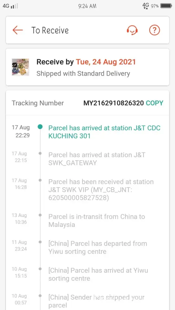 1. MY2162910826320 this tracking number I received but why the number cannot be found ? This parcel also still at station J&T CDC Kuching 301 since August 17, 2021.