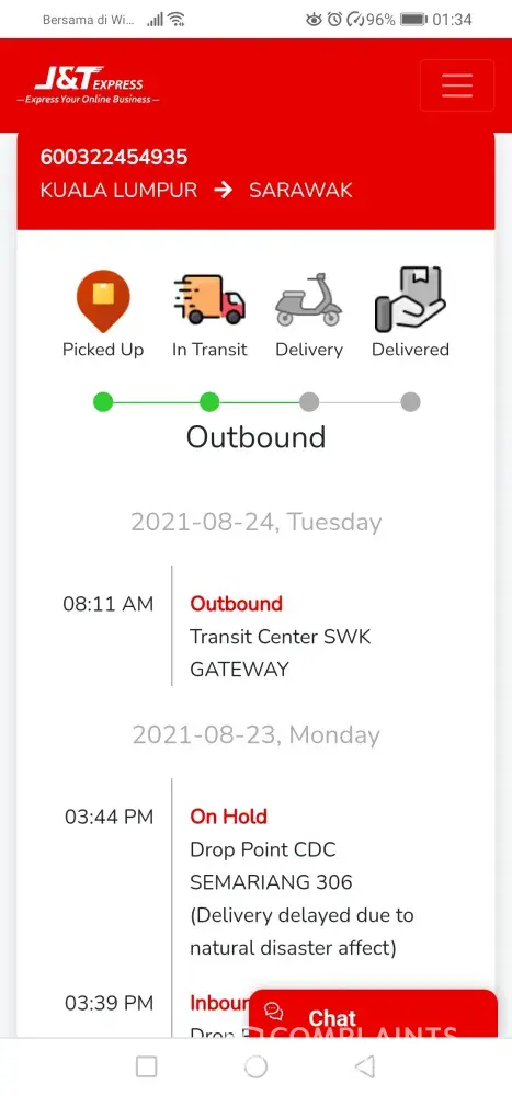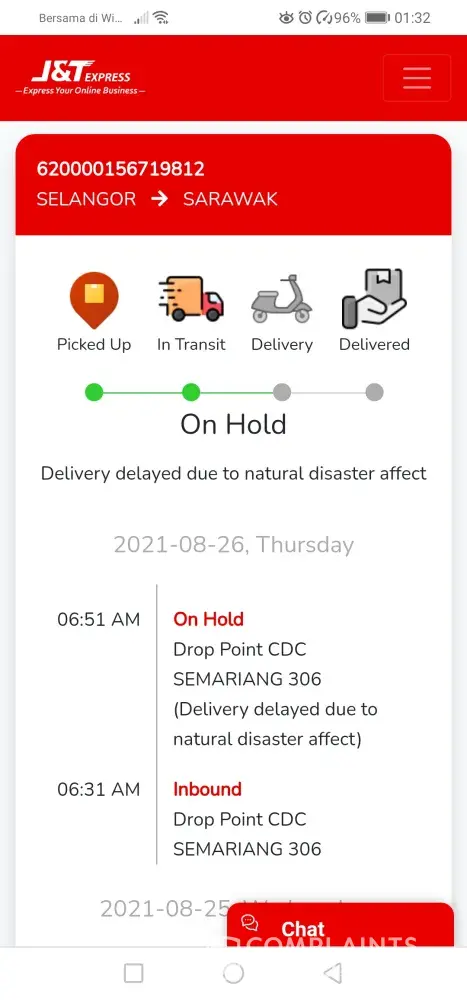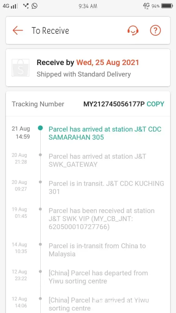 Saya telah membuat pesanan pada 13 ogos yg lalu dan sepatutnya barang diterima pada 21 ogos yg lalu, namun barang tersebut masih belum diterima sehingga sekarang dan tracking barang tersebut tiada perubahan bermula 20 ogos sehingga hari ini. Saya berharap agar pihak j&t dapat memberi perhatian dengan barang yg masih belum sya terima sehingga hari ini.