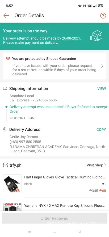 Hello po, meron po akong na received na parcel po ngayong August 23 kahit wala naman po akong inoorder. Nagbayad po ako tapos nung binuksan ko po yung laman hindi po siya katumbas nung binayaran ko. Nung nakaraan po meron pong tumawag sa akin na nagsasabing nanalo daw po ako, pero hindi po ako naniwala kasi po baka po scam lang pero dumating pa din po at ayun na nga po kinailangan ko pong magbayad kahit wala naman po akong inoorder