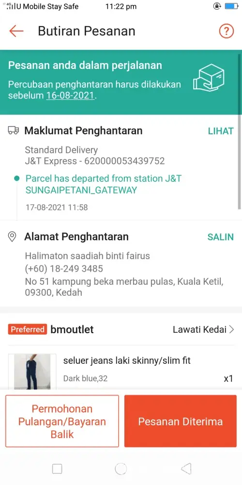 Saya telah menerima satu penghantaran dari Kuala Lumpur pada hari Ahad 22 Ogos 2021.