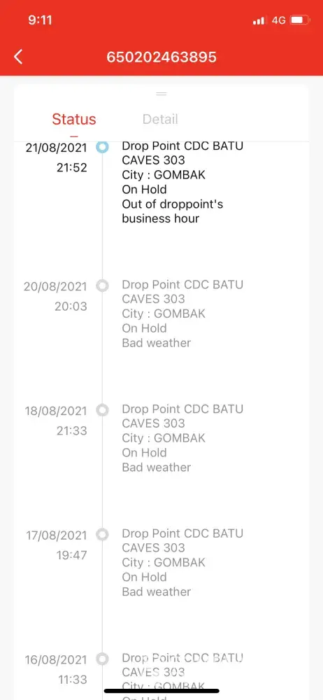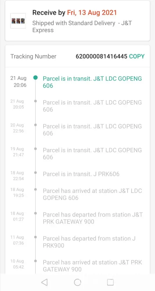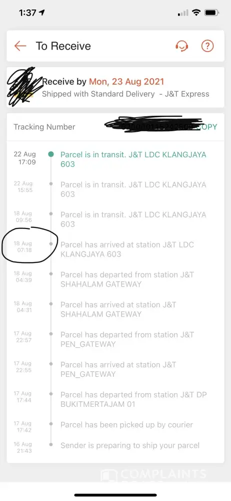 Already arrived at CDC Batu Caves 303 on 7/8/2021, but until 22/8/2021 still not out for delivery. Already call JNT hotline to make a complaint, but still no move. I'm not sure why they need 15 days to arrange delivery. Do your work properly!