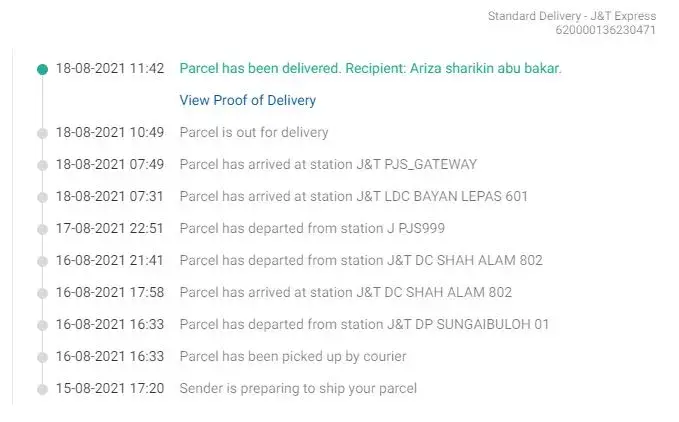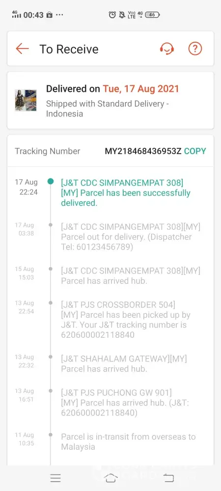 I ordered through shopee. On 17th Aug 21:57 pm the parcel has been delivered but i didn't received it! until now i didn't know where my parcel sama ada someone took it or the delivery guy really didn't sent my parcel! tau la kerja penat tapi delivery guy takde call or bagi salam ke apa! aku check shopee tetiba dah delivered tapi haram jadah parcel pun takde depan rumah aku! please take action la! this is not the first complain yang JNT dapat! pekerja part time ke full time ke jangan lah buat perangai taik macam ni! haihhh!