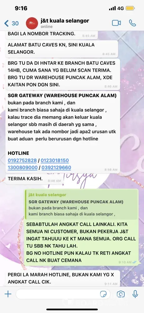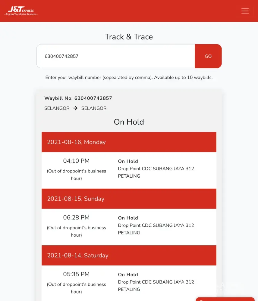 Hello, I would like to file a complaint regarding the service in CDC Subang Jaya PJS 312. The CDC J&T centre has been holding off my item for 2 weeks which reported it as out of droppoint's business hour. I have contacted J&T customer care 2 times regarding this issue and no effort has been made. This has been ongoing for other order items when delivered to this CDC as well, as well as reviews from others. Below I have attached the details of my current order which is still on hold.