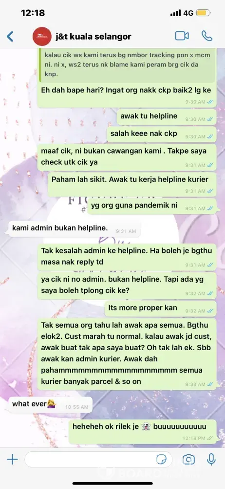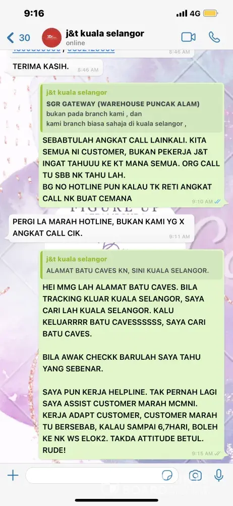 Its very rude & not supposed to be happened. Im already dealing with many couries services and mostly by J&T but this time your staff attitude very the worse one ever!