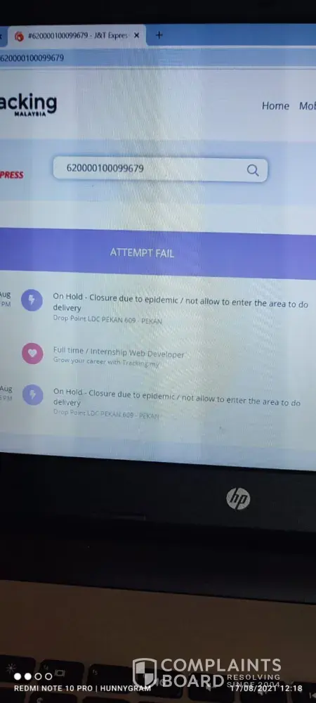 Hai, sy nak komplen barang saya yg di pos menggunakan JNT dari Kota Tinggi, Johor masih tidak diterima sehingga ke hari ini. Barang di pos pada 12/8/2021. No tracking [protected]. Bila trace, status on hold, drop point Putrajaya 329. Apa masalahnya ya. For sure kuih saya dah rosak.