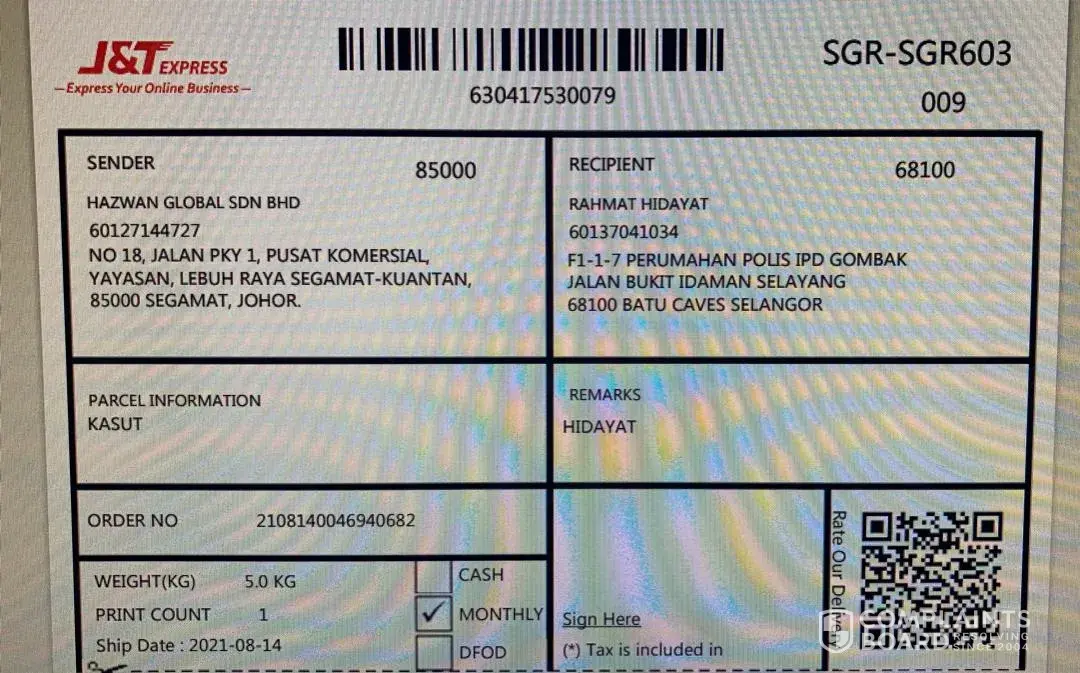 Date of item posted to J&T DP Baru Bangi 01 Hulu Langat : 2nd August 2021