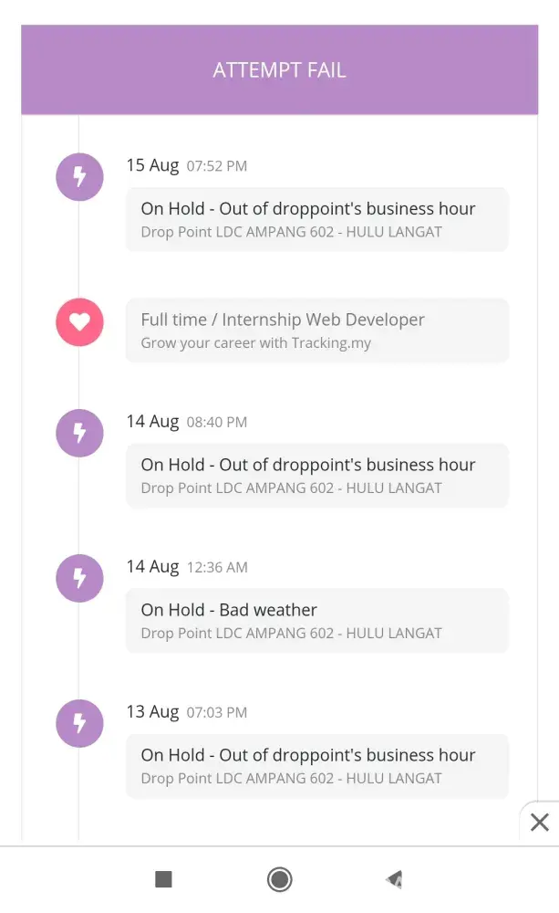 Parcel [protected] been in drop point ldc ampang 602 hulu langat from 13 august until now 17 august!