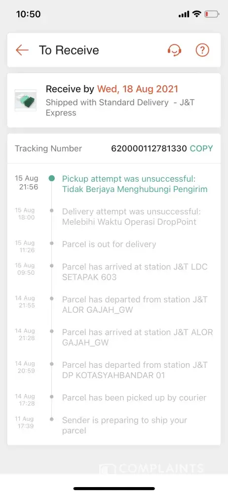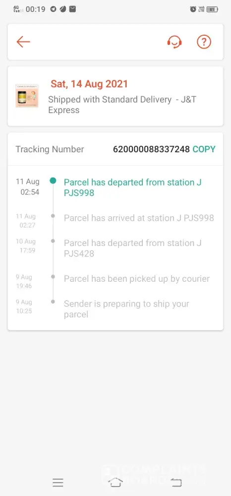 Barang yang saya beli pada 10/08/2021 melalui medium shopee sehingga kini 16/08/2021 masih stuck di station PJS 998. Diharap pihak jnt dapat menjalankan tanggungjawab untuk membuat penghantaran dengan kadar segera.. barang itu sangat-sangat saya perlukan ketika ini. Antara hidup dan mati.