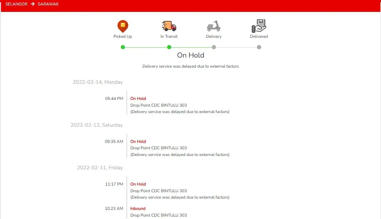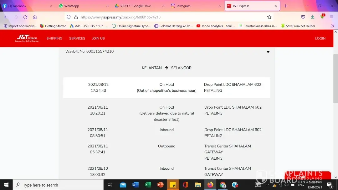 I would like to know the reason why J&T Shah Alam on hold my parcel since 11th August 2021. It's written in the tracking system because of Out of shop / Office's business hour. The parcel should be delivered to my family's house. So, how come it is out of shop? My parents is not working and there is always have someone at the house. The parcel was sent from Kelantan since 10th August but till today (13/8/2021) it was still on hold at J&T Shah Alam? How come it took so long to deliver? While my other siblings in Kajang and Bangi already received the same parcel 2 days ago, the same day it was post out to me. The foods inside the parcel might already rotten by now. PLEASE EXPLAIN TO ME!