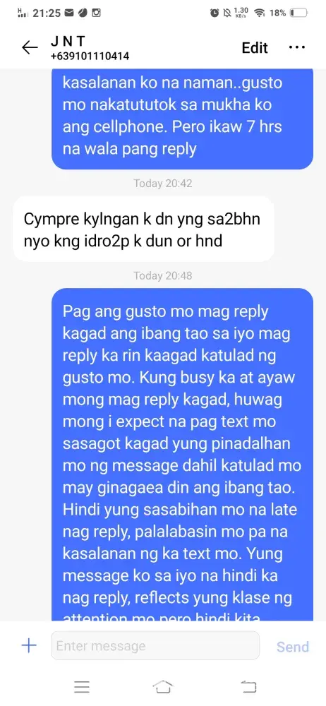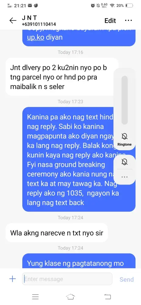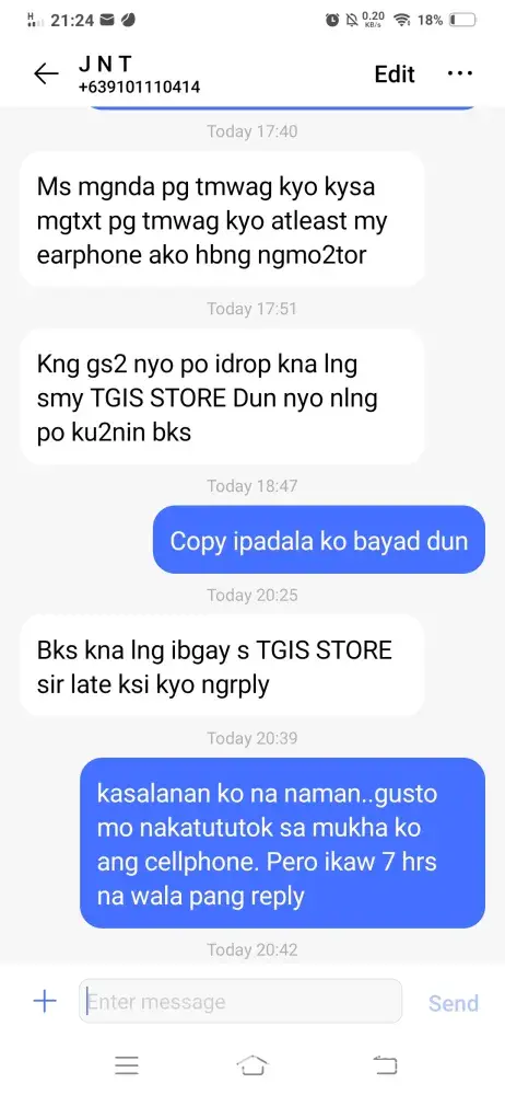 Your courier Rider:Randy Halog639101110414. Sent a message on 9:57 am on Aug 13 2021, i also have a missed call ay 9:58 am..during the period until 1030 am, I was attending a ground breaking ceremony. I sent a text message at 1035 asking for the cost and that I would send somebody to.pick it up because I am still busy and engaged. I did not receive any reply. Not until 1716 with the rider asking me if I still want the delivery or not. I told him that i am interested to receive the delivery he did not even bother to reply to me until that time and until the very moment he has not relayed the cost that I need to pay. He denied that he received an SMS message and I told him.that there is a digital signature that he received it and he then blamed me that he should instead called him instead of sending SMS. At 1751 he messaged that he if I would prefer, he would leave it in the shop in front of the PMA gate. I replied at 1847 immediately after seeing the message and coming from a meeting . He replied "Bks kna lng ibgay s TGIS STORE sir late ksi kyo ngrply" you have a rider that would not bother to reply to a customer but would demand that the customer should be on their toes to immediately reply to him but he is nmot obliged to do so for the customer.