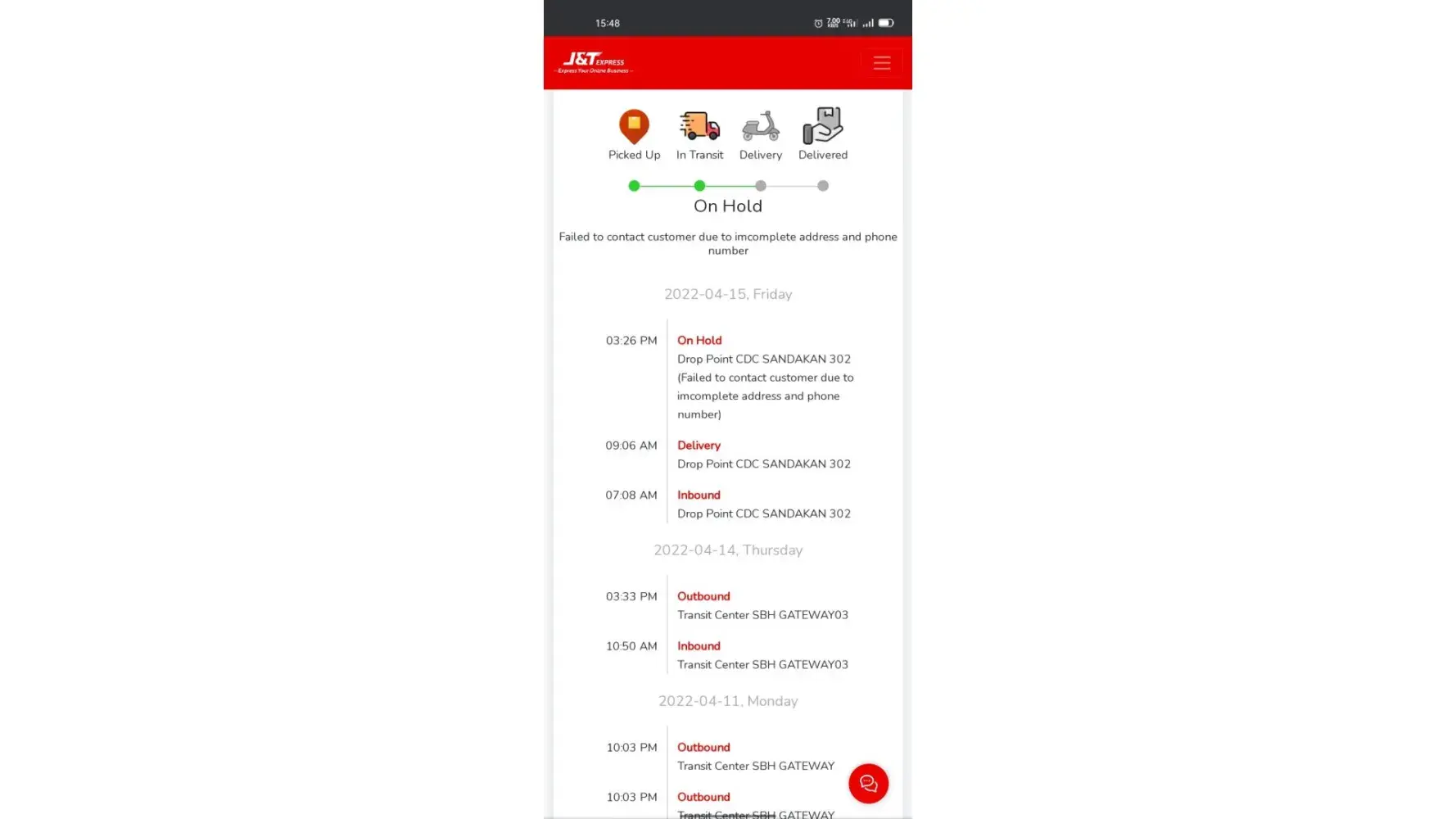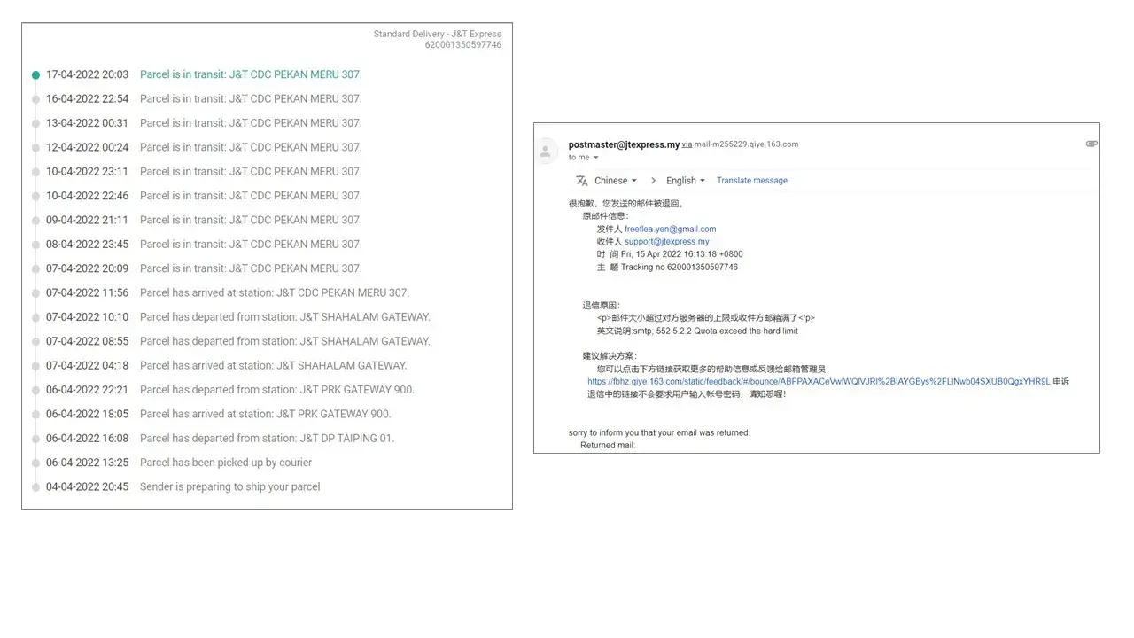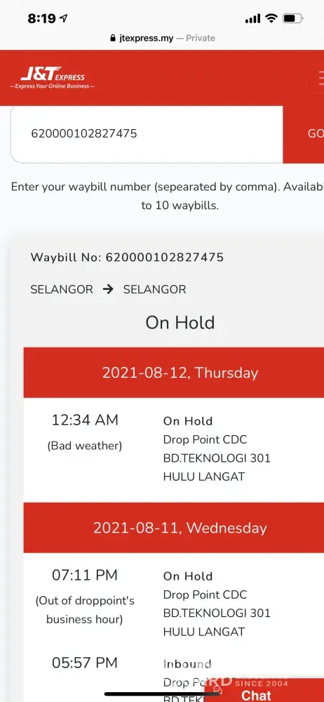 Me too... My parcel "on hold" since 7-April at J&T Pekan Meru. I called all the phone numbers, none answered. I sent email, it says "Quota exceed the hard limit".