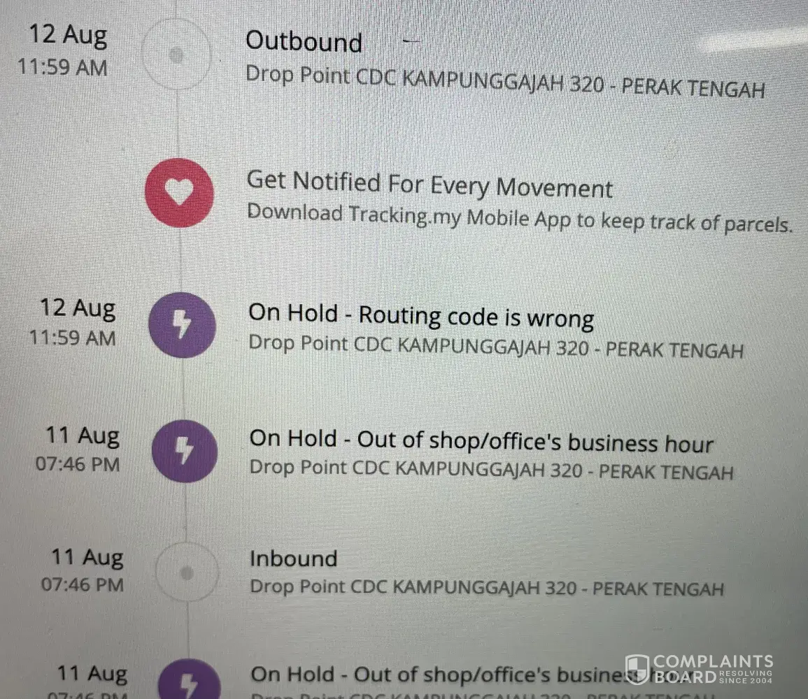 My parcel has been stuck so long since 9/8. initially missed routed to kampung gajah since 11/8 till now which is suppose to be delivered to teluk intan .. it's been on hold since then . Have called up helpline and reported many many times . Please do something. My gods have to be delivered by this week.