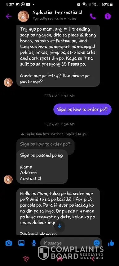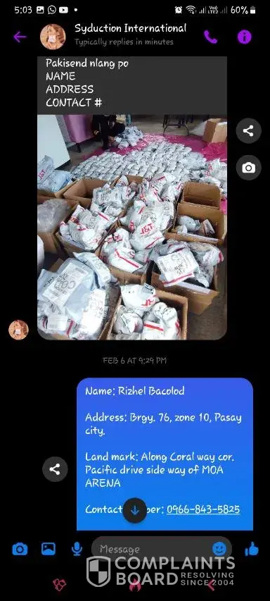 Hi I would like to complaint regarding for NO NOTIFICATION RECEIVED from the courier. This was the second time that I order with J&T partners for delivery and I was absolutely upset due to this unacceptable reason. I order to Syduction International last February 6, 2023 at 9:18am and place my order same day at 9:29pm. I do also, ask the coordinator for how many days for the deliveries arrival and answer me 2 - 5 days upon placing of order. I keep waiting and asking for trucking number for me to be able to locate my order and only to find out that my order was unsuccessful due to the customer is not around. My first encounter was the same reason and I felt being disadvantage because I need to pay for the cancellation fee without receiving any notification from your team and obligated to pay for them not to post my picture with accusation as a FRAUD. Hoping for your investigation and acceptable answer with this. You may reach me thru below details: