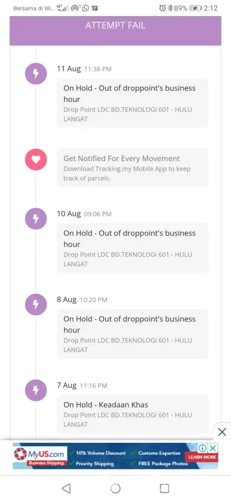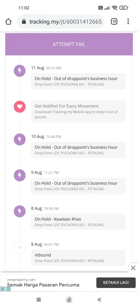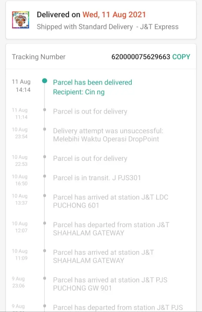 So my parcel have arrived at cdc puchong on 10/8/2021, and the next day hold because of bad weather, its okay la... And the I bet la they will deliver the parcel yesterday but on hold again because of (out of drop point's business hour).. Can you imagine, you don't give the update, when you go out for delivery, then suddenly appear out of business hour at 9.18pm? And today not a single update from jnt, and I still wait and keep calling jnt like a fool cause no one pickup that f*g phone.. Please deliver my parcel quickly, its urgent
