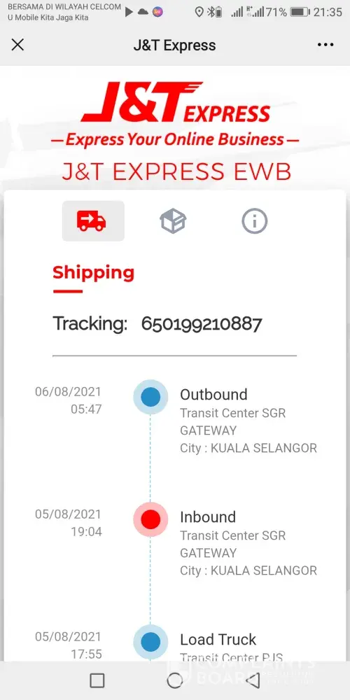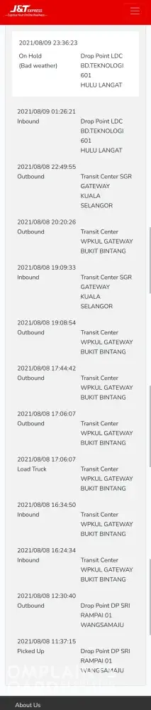 Parcel di poskan dr j&t sik kedah pada 6.8.2021 ke 4 alamat berbeza.. Parcel ke 3 alamat lain telah sampai ke customer pada 7.8.2021(esoknya.. sgt efisyen).. Malang Ya parcel saya sampai ke j&t bandar teknologi kajang pd 7.8.2021 jam. 10.41pg dan sampai ke hari ini 12.8.2021 saya belum terima parcel saya. dah 4 kali call customer service.. jawapan yg diterima tetap sama.. over loaded parcel.. masalah pekerja.. dan pihak customer service akan Highlight kpd cawangan.. DAH 5 HARI Berlalu.. parcel tak jugak sampai... parcel masih stuck kat bandar teknologi kajang tanpa apa2 tindakan... WHYYY?.. saya faham U guys banyak barang masa CMCO ni... tapi jangan la sampai ANIAYA CUSTOMER ! Kami bayar service U All... Bukannya free & Bukan murah tau byrn service... call centre mmg langsung tak berangkat.. Baik tutup jer cawangan tu kalau ta boleh nak manage dari menyusahkan org dan nama J&T jgk yg buruk.. MEMANG TERUK SGT LA SERVICE U ALL DI CAWANGAN BANDAR TEKNOLOGI KAJANG... TERUK SANGAT2...