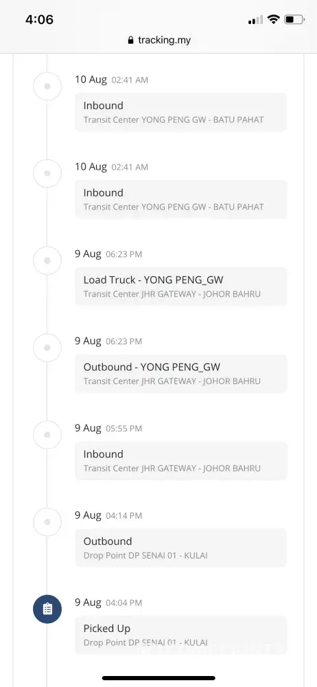 The parcel is at transit ctr kuala selangor since 6/8/2021