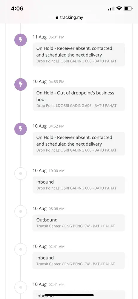 My parcel already inbound at drop point LDC Sri Gading 606 on 10/8/2021 but on hold with remark - receiver absent and schedule the next delivery. 11/8/2021 still same remark. Until 12/8/2021 my parcel still not out for delivery.