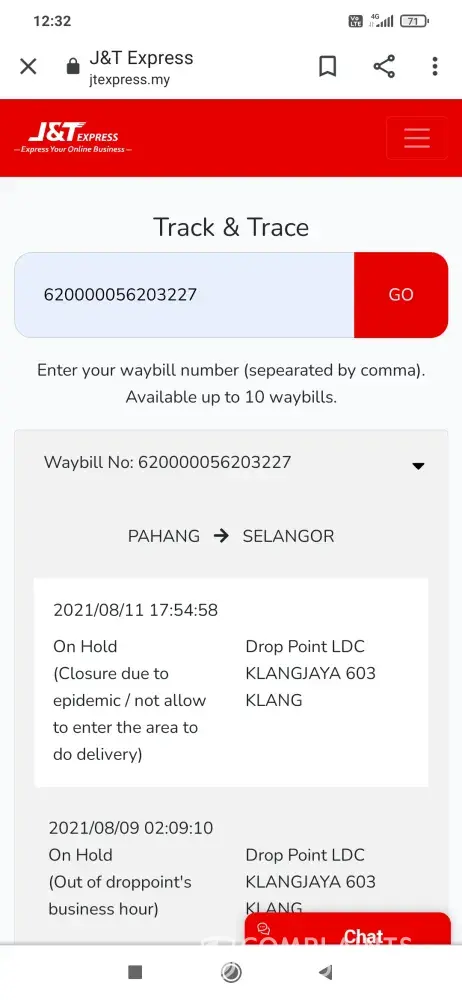 Dari 9hb still kat jnt Klang jaya 603, lpstu takda update apa2 information..last update status tak boleh delivery sbb kat tmpt saya sebab tutup pandemic..kat tmpt sye elok je takda nya tutup..kalau tak dapat hantar barang tolong bagi alasan Yang Okey sikit ni da 4 hari baru nak update macam Tu, bila call hotline takda respon..call jnt Klang jaya Sama jugk takda respon..