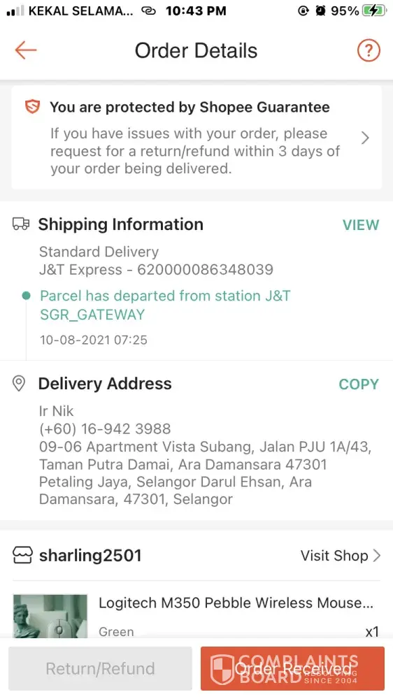 My parcel stucked in gateway kemuning centre and delay for a a day. I was so surprised today on 11 August 21 @ 1.24am I received the notification that my parcel has been delivered but I did not receive anything. Please solve this matter for me. Tq. The tracking number is [protected].
