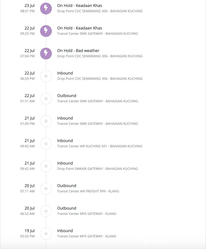 I have package that was shipped from Klang, and was due to arrive mid July. While it did arrive in Kuching mid-July, it was stuck under investigation since 26th July.