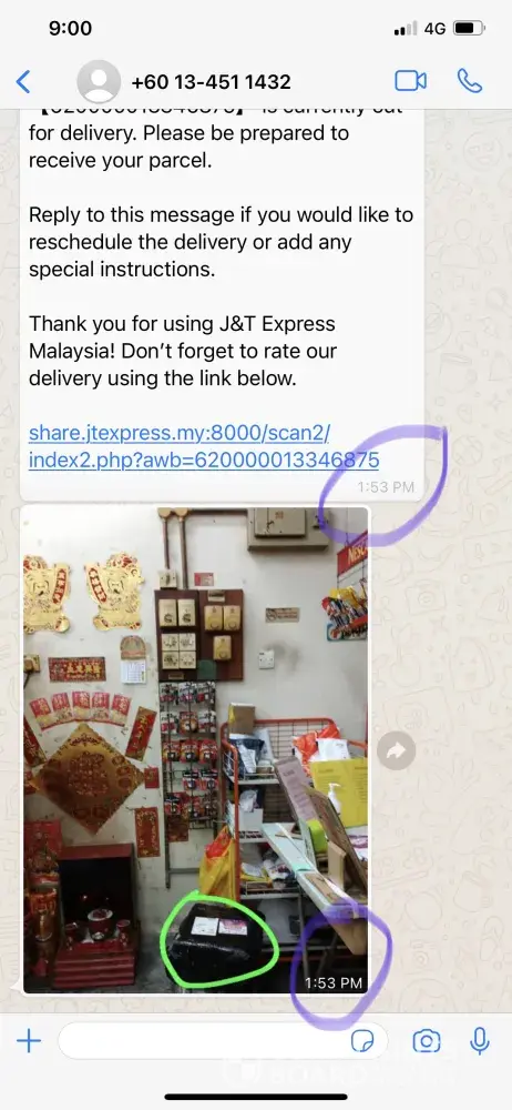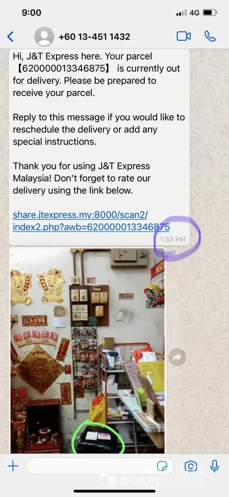 Saya semak di tracking j&t bahawa barang sudah sampai dengan bukti bergambar. Tetapi, bukti bergambar boleh diragui kerana penghantar barang hanya ambil gambar barang beserta tangannya sahaja. Tiada gambar penerima.