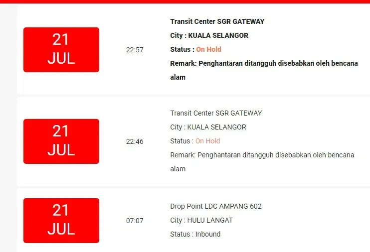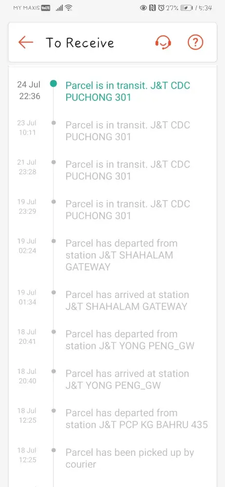 Stuck atau hilang sangkut at jnt transit center pjs gateway klang city on 18 julai 2021 at 8.38am
