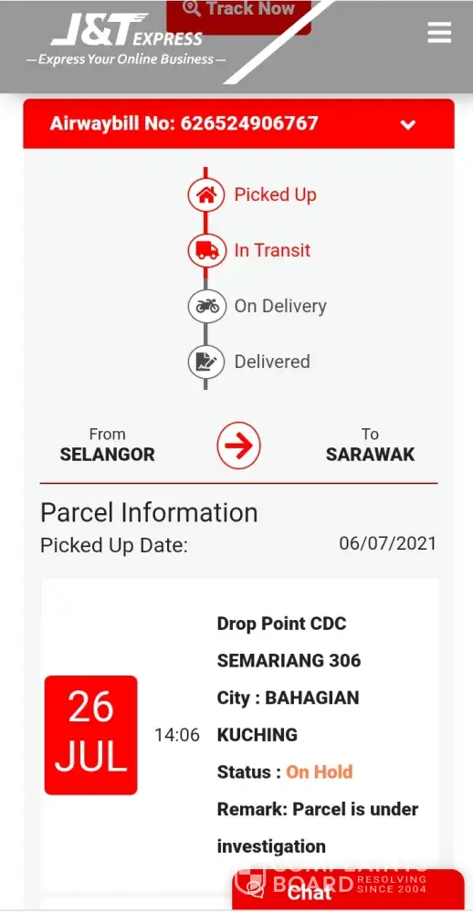 Parcel hilang .parcel lost at transit center pjs klang city. parcel lost on 18 julai 2021 at jnt klang hub