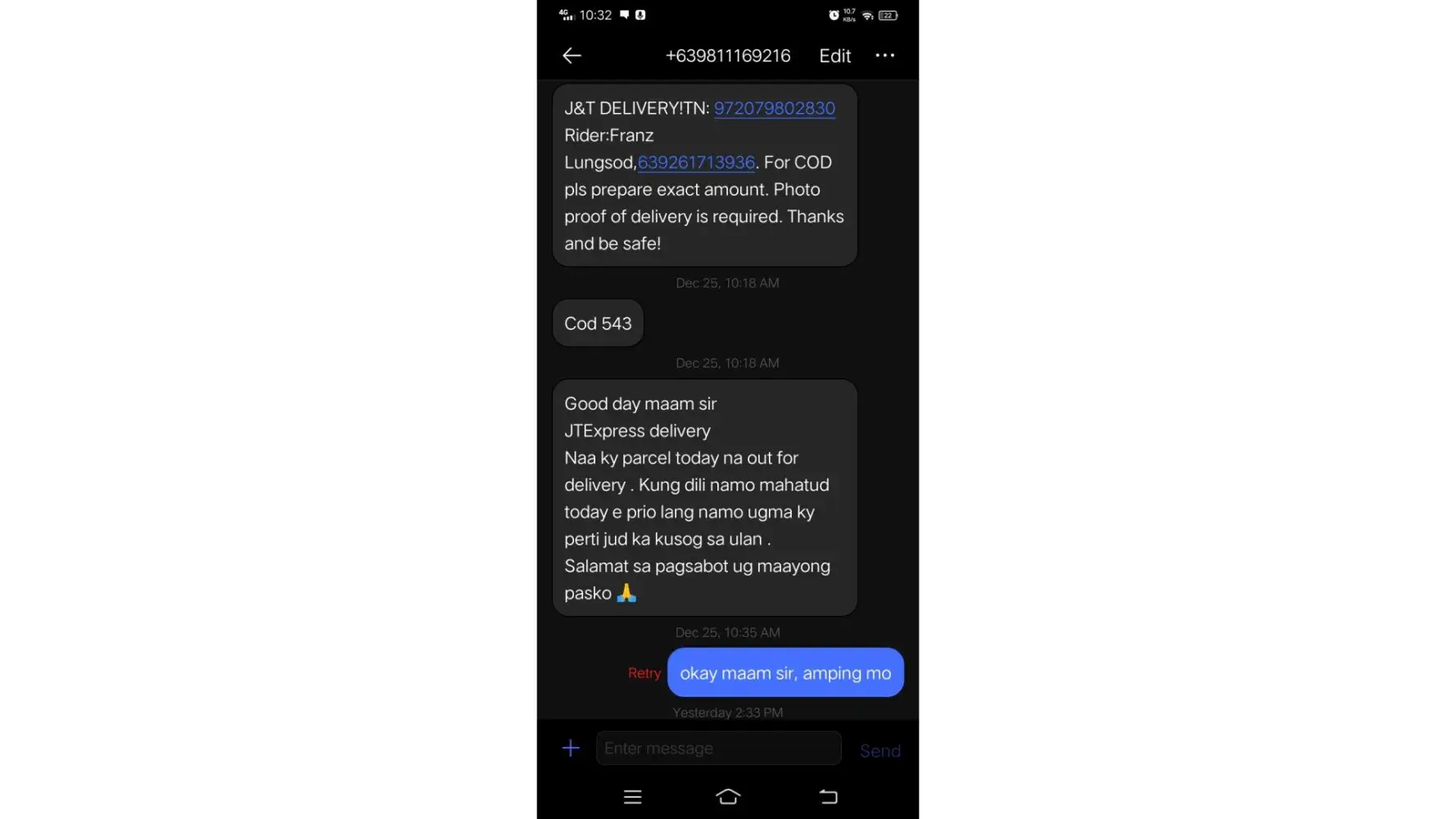 Hi Good morning and Merry Christmas, My Christmas was really good but it was ruined by one of your rider , i was really patient and understanding cause cause his reason was raining hard but he hadnt delivered it for 2days already now is the 3rd day and there is no rain i called your rider if he could already deliver it cause i have works to do but your rider sarcastically replied theres still rain and even if it's not that hard i could still get wet and they cannot deliver it if theres still rain i checked the weather but theres no rain i told them that it will go on RTS but rider told me they cant do anything about it if it will go on RTS they wont deliver the parcel cause it's still raining (even tho theres no rain) i told them that it will go on rts if it will not be delivered today i will file a complaint but rider had the audacity to say just file a complain and go to the office so that we could file a complain how disrespectful your riders are?, PLS TAKE AN ACTION TO THIS ISSUE BECAUSE IVE BEEN EXPERIENCING THIS EVEN BEFORE, I EVEN HAVE A LOT OF RELATIVES WHO COMPLAINED A LOT CAUSE RIDER WONT DELIVER THEIR PARCEL. WHATS THE USE OF COD THEN? THE RIDER EVEN TOLD ME TO GET THE ITEM ON THEIR OFFICE INSTEAD THE NAME OF RIDER IS FRANZ LUNGSOD HIS NUMBER IS [protected] and +[protected] my order tracking number is [protected]