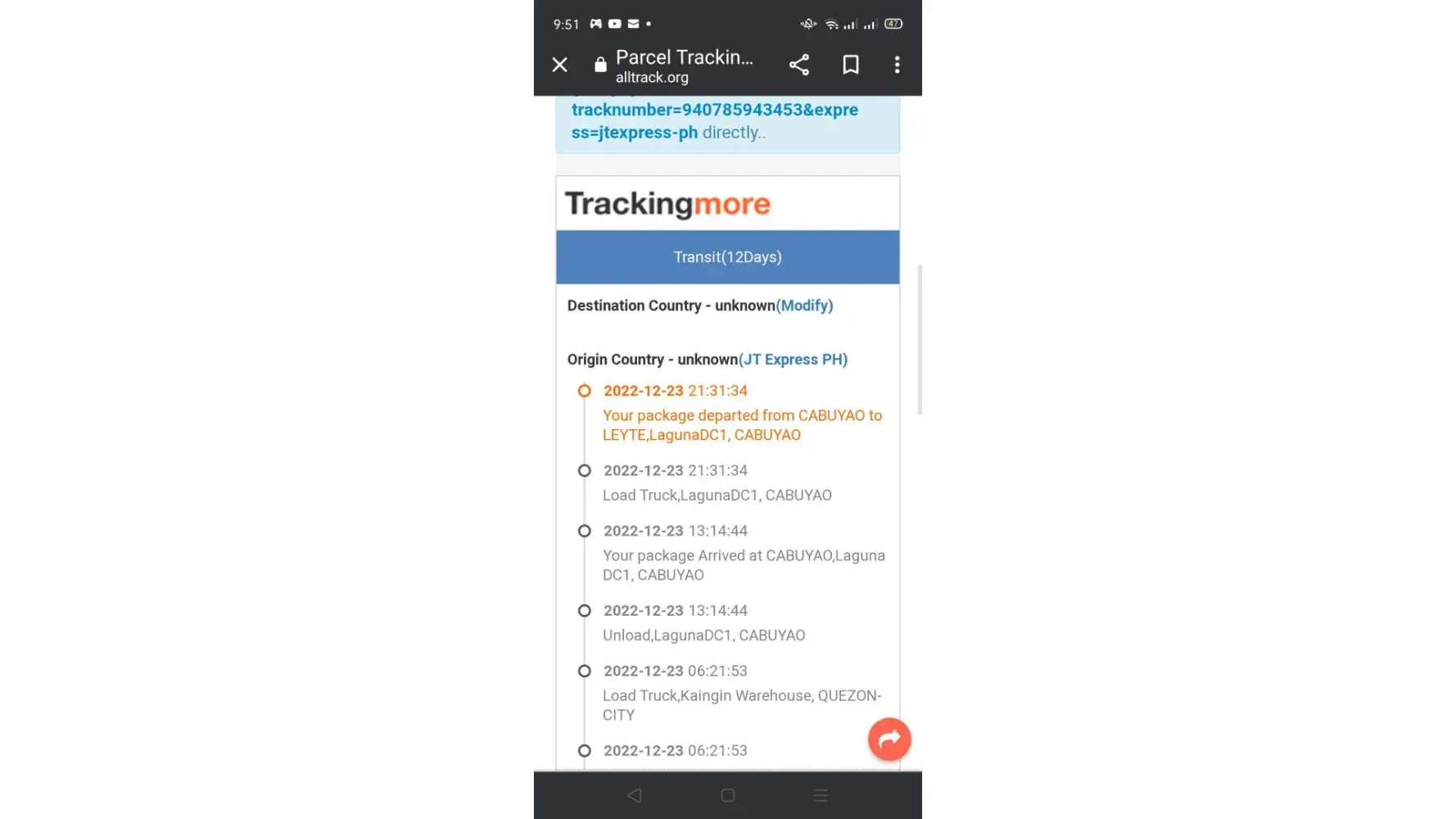 J&t, pasuyo naman po.baka naman po magawan nyo ng paraan kung nasaan na ang parcel ko.as per checking sa tracking system nyo december 23 pa lang nka transit na from cabuyao to leyte and until now wala na update sa system nyo may 12 days napo.please lang,nauna pa dumating saken ang malalayo at huli kung mga inorder.ito masyadong late grabe.bayad na po yun nakakadismaya! Tracking no. [protected] pasuyo please lang.