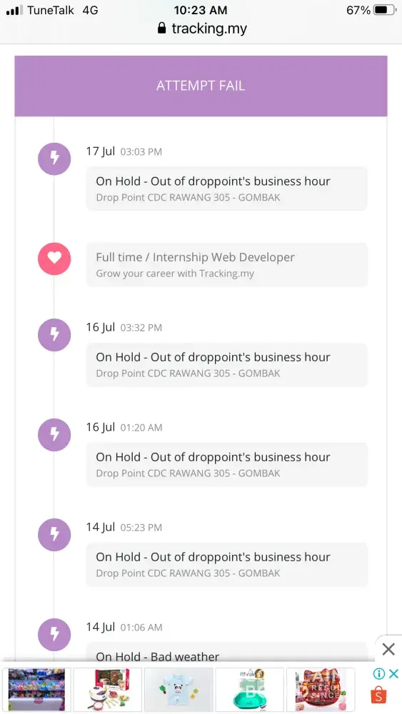 A week waiting for the parcel, the parcel is arrive at my area but status show the item past over between 2 hub in the same area in Puchong.