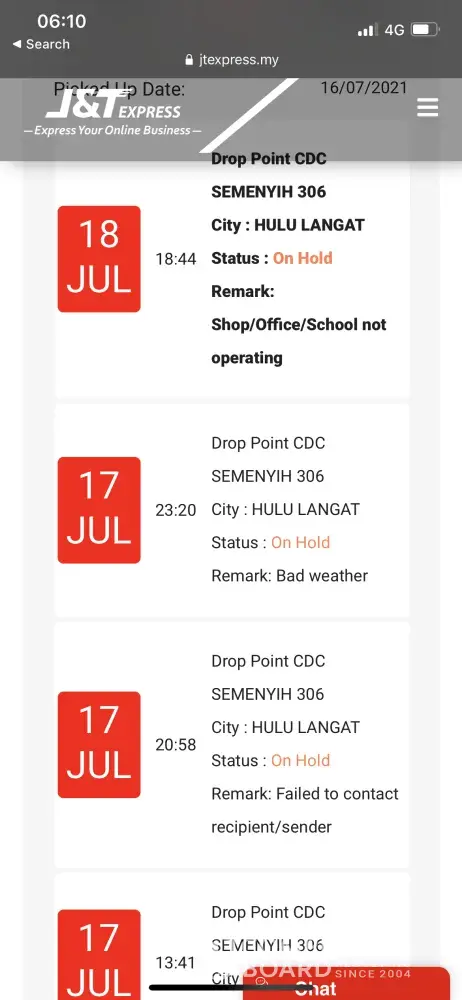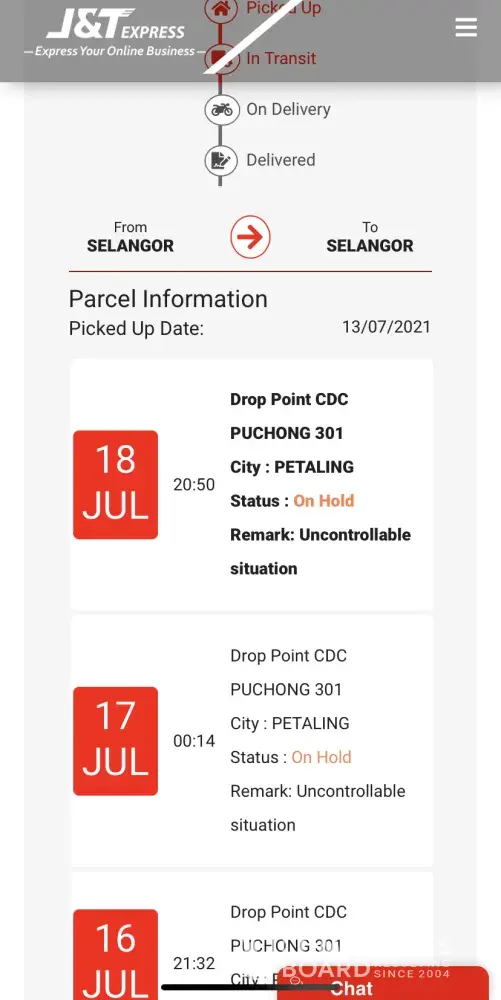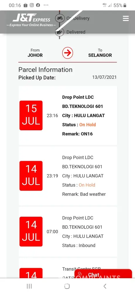 Parcel sent on 13/7 from same area (petaling to Puchong ) with same state but today 19/7 still in On Hold status, I have another parcel from Ipoh sent 13/7 received by 14/7, any problem to J&T for those On Hold parcel for few day?