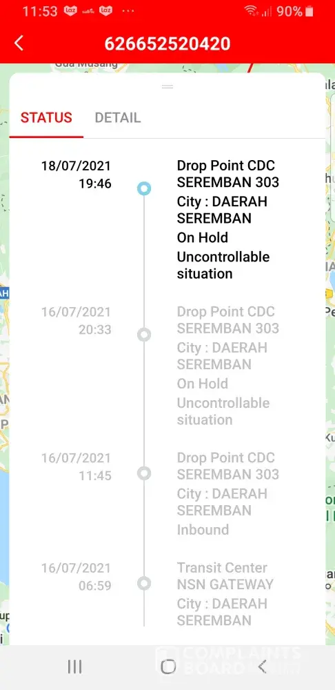 Jnt cyberjaya 615 peram brg dah 3hari..smlm buat aduan dkt jnt servis die ckp akn hntr secepat mungkin..tgh hari cl lg bru ckp jnt cyber kena tutup seminggu...kite phm situasi skrg tp nape kite cl xangkt..kite blh collect sndiri brg tu..makanan kot..sape nk gnti kalu rosak?plzz la kite byr bkn free..at least inform customers..ni tak hold je 4ari ingt blh setle mslh..no telefon ade kn..dh terang2 tulis mkanan ptt cl la taye blh tak pick up sndiri..brg lain xpe ni mknan kot..