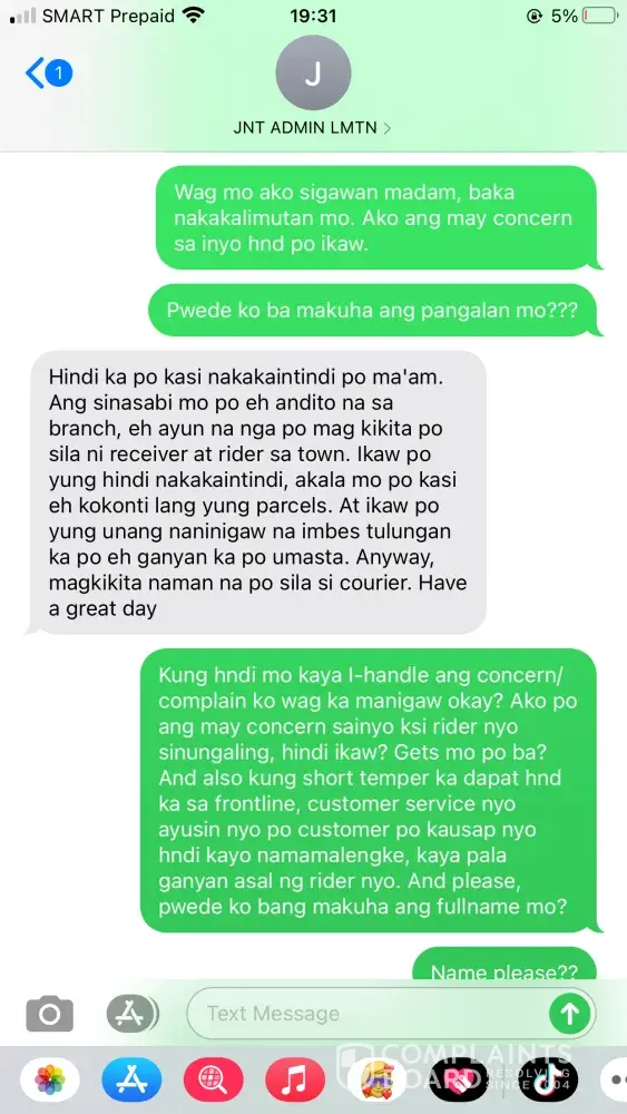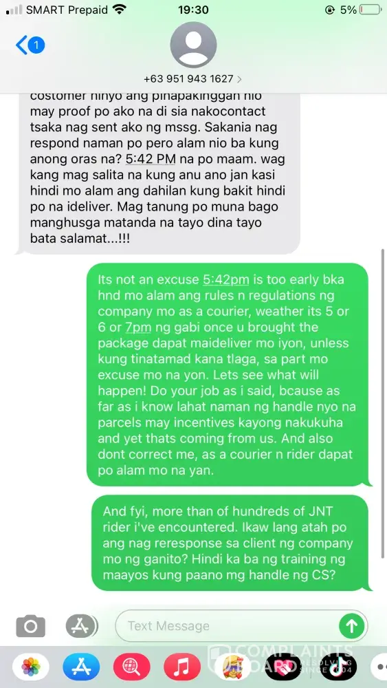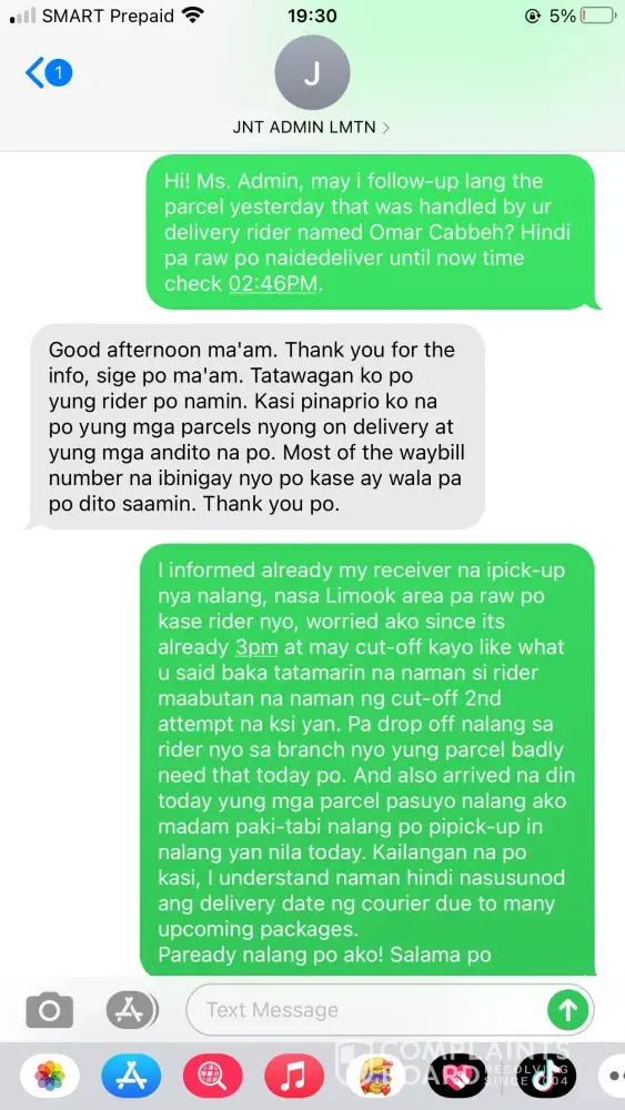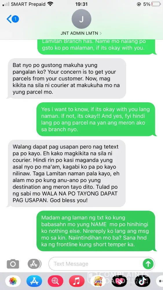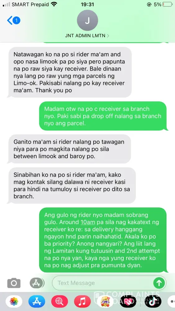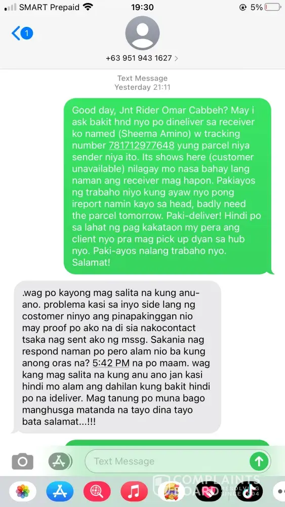 (Omar Cabbeh), the courier reported that my receiver was unavailable that time date May 8, 2021. On behalf of my receiver it is not true because my receiver wasn't leave the house that day because she was expecting her delivery that day. My receiver once told me that its happened for many times if the rider is neglected they really don't deliver it to the receiver. I texted the courier that night May 8, 2021 at 9:11PM asking him why he didn't deliver the parcel of my receiver because badly need the parcel because my receiver will going to use what she bought to me on Eid'l Fitr day. But suddenly this issue came up, the rider replied to me that night. Please see printscreen below! I feel humiliated on my part because I've encountered a more than of hundreds of JNT rider but this one is different, they don't know how to handle customer complain. Yes! Really, they are! Later that night around 9:36PM the admin of the Lamitan-Branch called to me saying that my concern was raised to her by the courier. The admin of the branch explained to me everything and I also seek a help from her because i'm counting on her. If she can tell the rider to please deliver the parcel of my receiver tomorrow morning May 9, 2020 she said that there is no problem with that. She also said that she will priority my request, and I also told here that I have more than 10parcels to arrived that day May 9, 2020 I even send to her all my waybill no. to please monitor all of my parcel and to please do not RTS any of my parcel coming from me, because the rider of this branch once they feel neglected they really don't deliver the packages to the receiver and thats the problem with that Branch. Around 3pm in the afternoon May 9, 2021 my receiver texted me that the delivery rider wasn't there pa po and its already 3pm in the afternoon. The admin of the Branch once told me that their cut-off is every 4pm in the afternoon. I told right away my receiver to just go to the branch for her to be able to get her parcel because its already 3pm in the afternoon they might RTS it once the delivery is unsuccessful. I texted the admin of the branch right away about the situation, the admin called to me and talked to me in a sarcastic way she even shouted at me and she hung-up the phone right away. What a shame! The admin of this branch has a short temper.