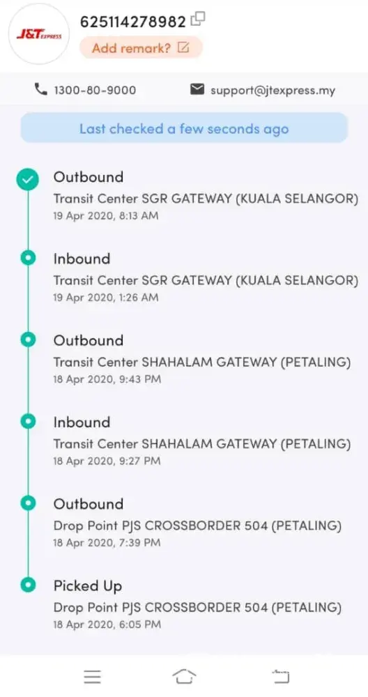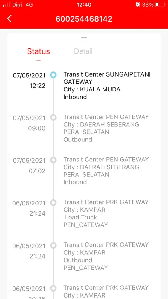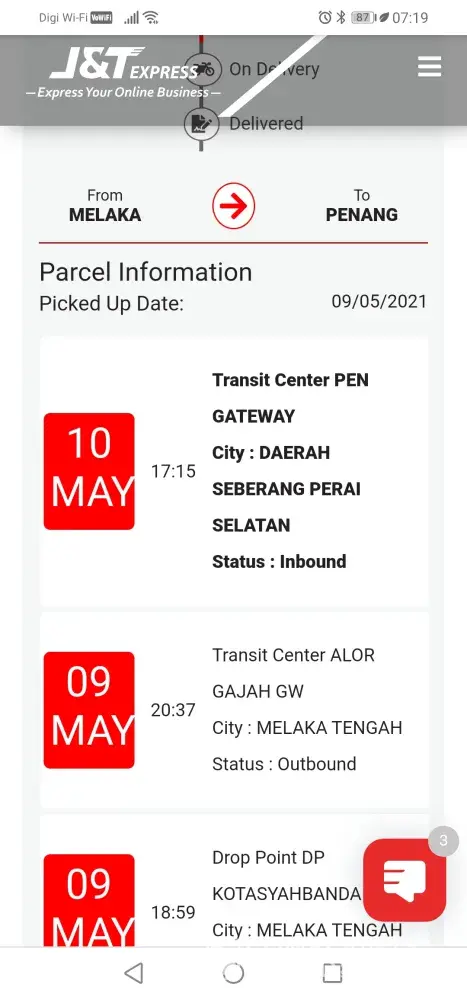 I went to J&T Express to courier a parcel from Ipoh to Penang on the 6th May 2021. Next day I check the status it shows the parcel is at Kuala Muda (7th May 2021) already. Then the update keep remaining on 7th May 2021 until today.