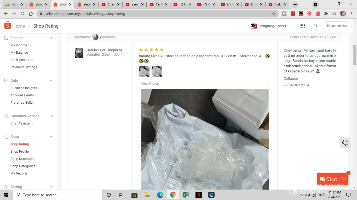 pada hari ini 16/4/2021 pelanggan saya telah menghantar aduan bahawa barang yang diterima rosak teruk dan pecah. walaupon setelah di wrap dgn bubble wrap dan ditampal dengan sticker fragile.