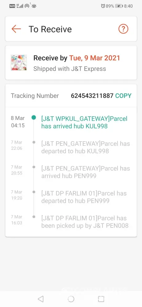 Shipment post out since 24/2/2021 but not yet arrive. I'm not receive any call from J&T team. Please check where is my parcel.