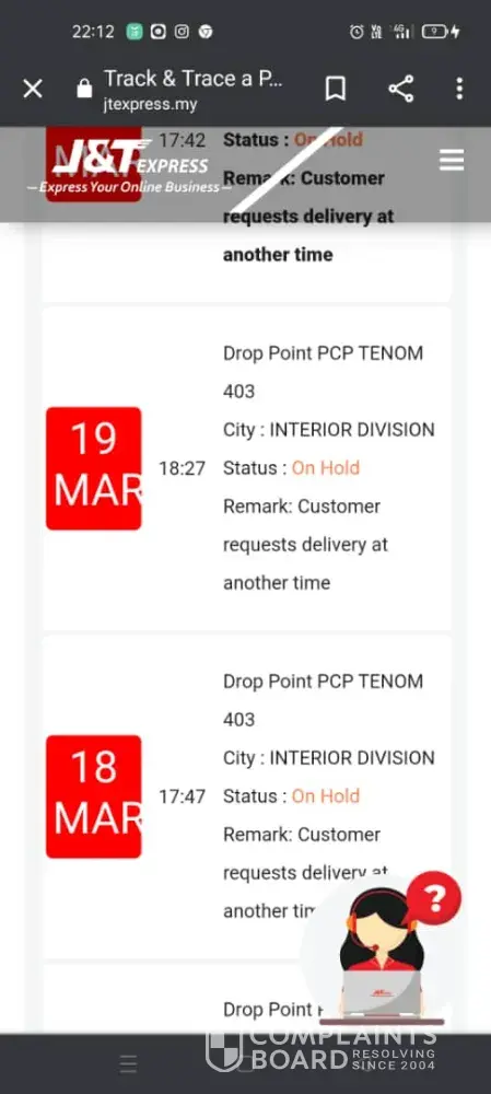 My parcel reached J&t storage hub Seri Kembangan since 9 March and it should be received on 10 March. However, it still stuck at there until today 13 March. It was already 5 days and the status is still showing 'on hold'. Can I know what's happening? I really need that parcel ASAP pls...