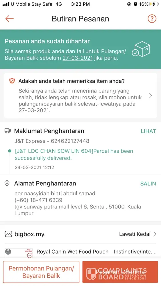 Disini saya ingin memberitahu bahawa barang saya dah terperap lama kat J&T WPKUL 998, barang saya tu kecil je, bussiness card risau tercampak2 ke mana je tak perasan sebab ada 19 helai je dalam tu. Tracking number adalah [protected], dah dekat dah dengan rumah kat wangsa maju. Pleasee saya perlukan dengan kadar segera. ðŸ™ðŸ˜
